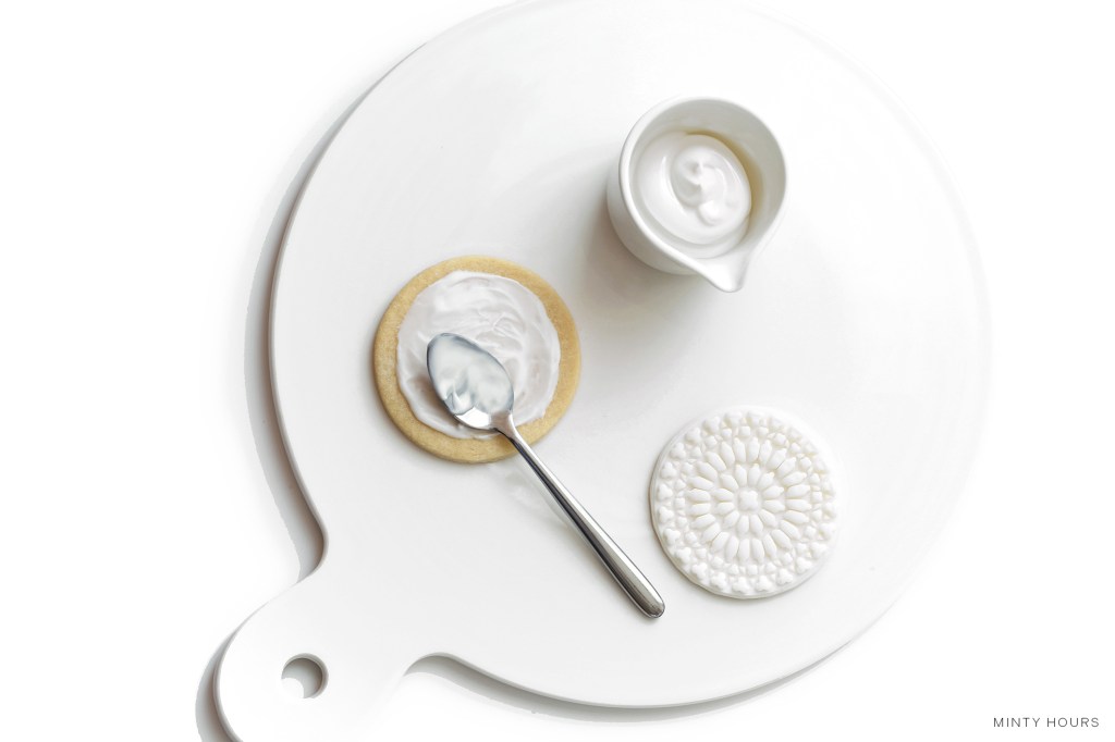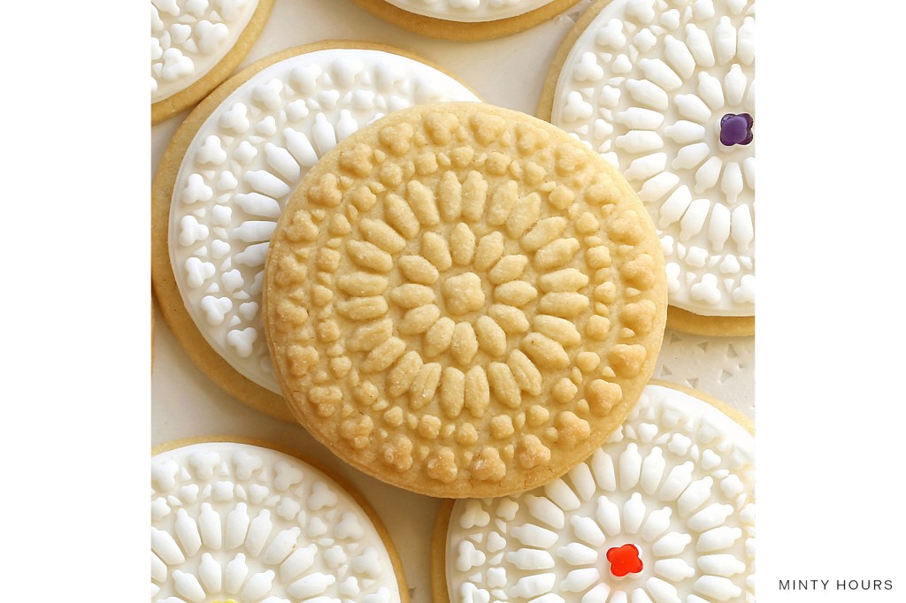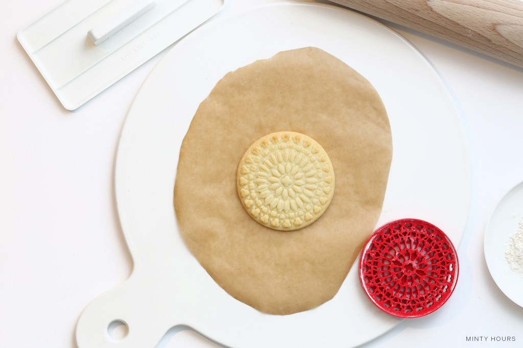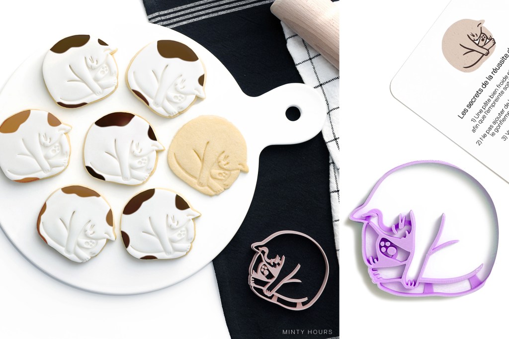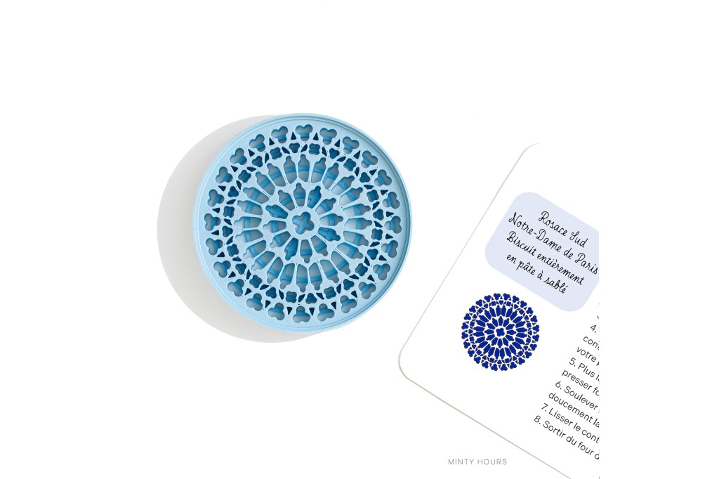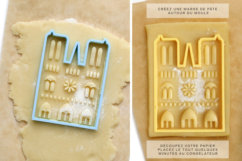 Si vous projetez de réaliser également des biscuits nappés de pâte à sucre, ajoutez l’option du moule du contour. Ce contour – un peu plus grand de 4 mm que l’empreinte – est vendu avec le petit tampon du cœur de Marie. Tout est disponible ici : SHOP MINTY HOURS