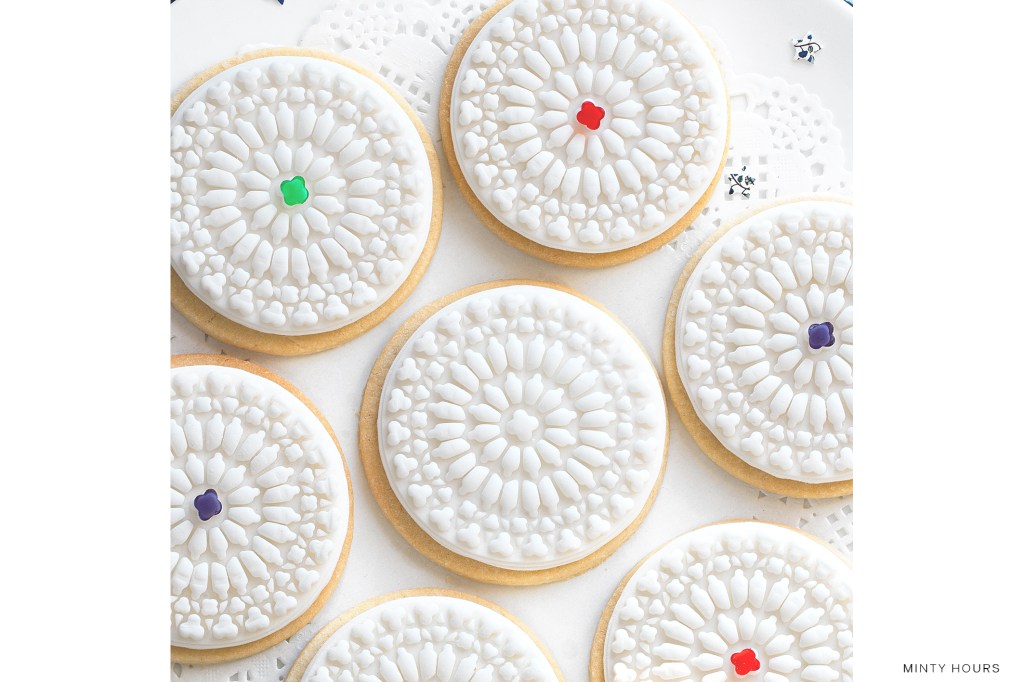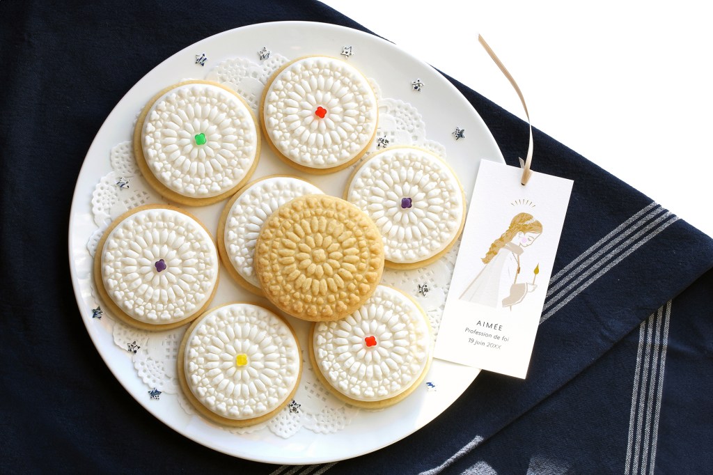 · Présentation : Disposez vos biscuits sur un plateau en argent ou un beau plat tapissé de papier dentelle, et parsemé de confettis pour les mettre en valeur lors d’une fête de la foi. Si le plateau présente des irrégularités de surfaces (bosses, creux), il sera à utiliser au dernier moment, vos biscuits auront besoin de patienter sur une surface vraiment plane. La pâte à sucre ne se déforme jamais après sa découpe et son marquage, à condition de garder vos biscuits bien à plat.
