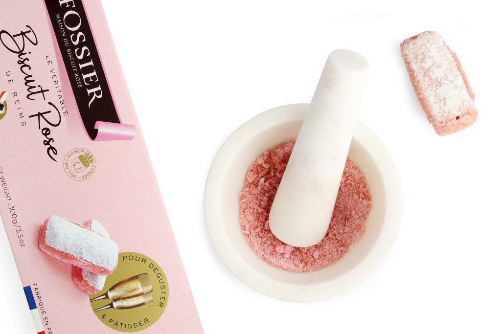 Vous pouvez choisir la recette des sablés aux biscuits roses de Reims. Dans ce cas, notez que le broyage en poudre des biscuits et des amandes a un impact sur le rendu : plus les poudres obtenues sont fines, plus le résultat est lisse et délicat. La poudre d’amande sera sélectionnée aussi blanche et fine que possible.