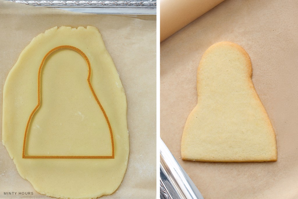 4. Utiliser l’emporte-pièce du contour de la Vierge pour marquer et découper cette forme dans la pâte. Le bord le plus fin s’enfonce dans la pâte tandis que vous avez en main le bord le plus épais