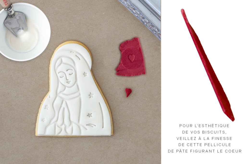 Il ne reste plus que la jolie finition du cœur de Marie sur une fine pellicule de pâte à sucre. Cette réalisation peut s’effectuer au moment de la création de son empreinte.