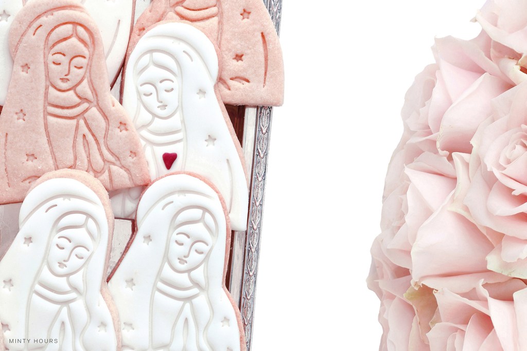 - Continuer à faire sécher les cœurs tandis que sèchent les empreintes. Une fois que tout est bien sec, peindre éventuellement les cœurs. Après séchage du colorant alimentaire, coller le cœur sur la poitrine gauche de la Vierge (là où il y a le plus d’espace, près des mains jointes). Comme pour les empreintes à faire adhérer sur les biscuits, vous utiliserez la même préparation Candy Melts (ou bien de la colle alimentaire). Faire de nouveau sécher, puis servir vos ravissants biscuits.