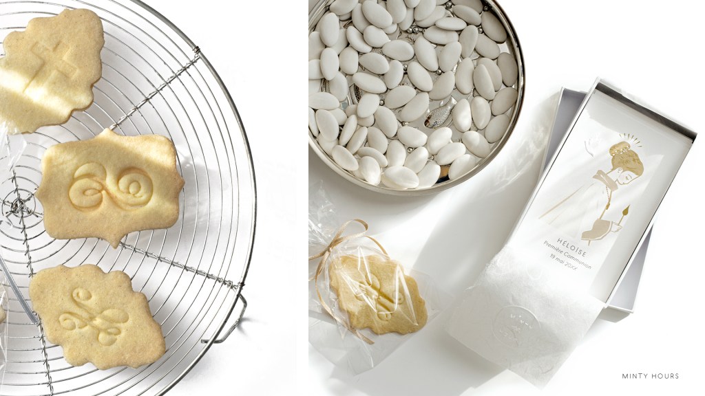 Si les dragées et signets représentent de beaux cadeaux traditionnels à offrir lors d’un baptême, d’une communion, d’une profession de foi ou d’une confirmation, une tendance se dessine depuis quelques années : l’ajout d’un joli biscuit maison, tamponné d’un prénom, d’une colombe, d’une croix, d’un calice, ou d’une initiale.