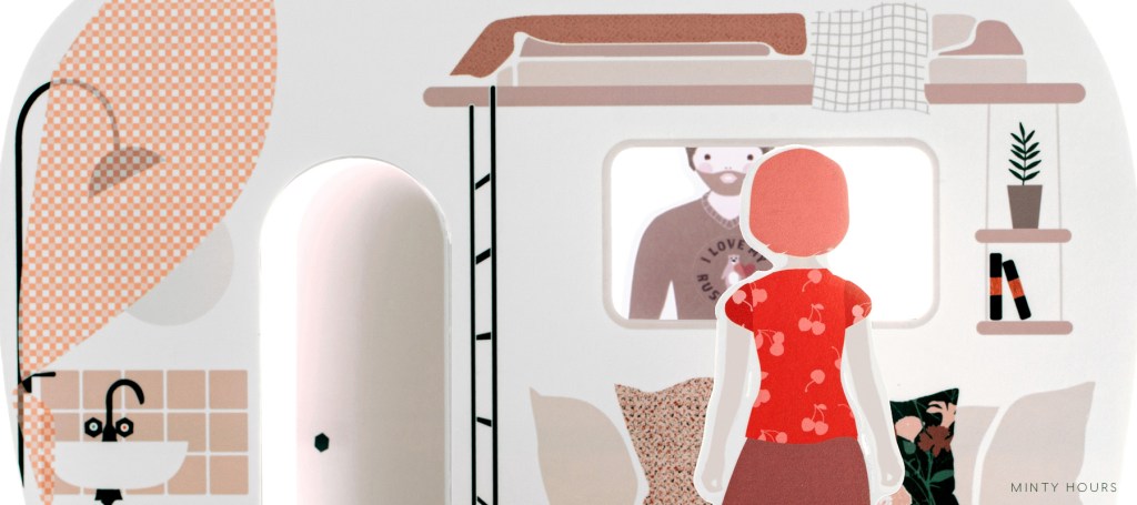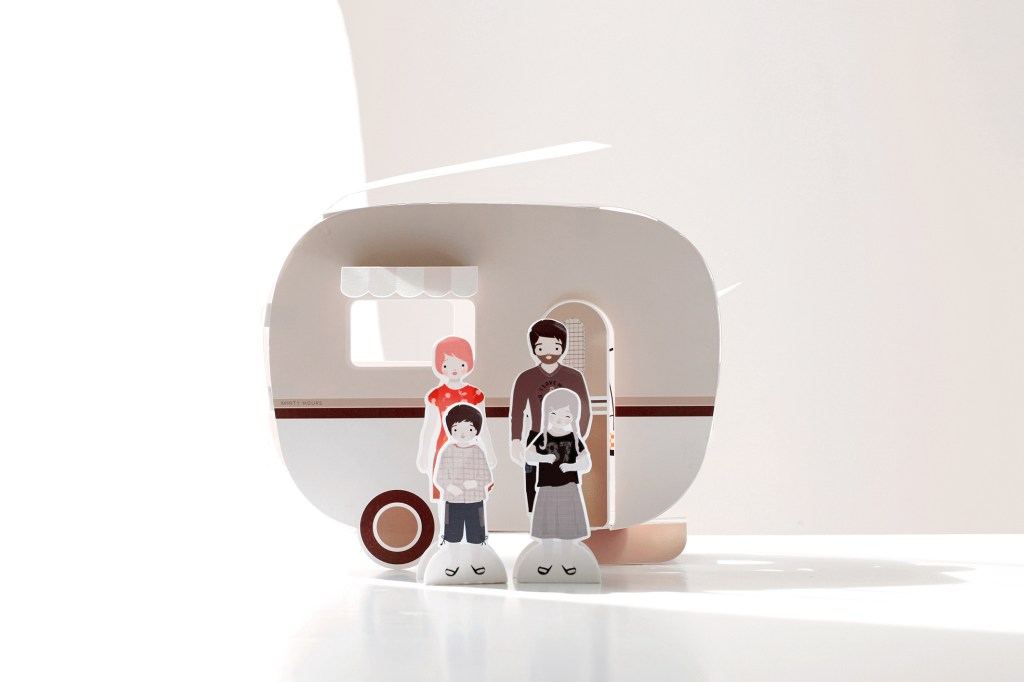 Voici la Maman qui s’affaire dans la caravane. Sa petite fille s’apprête à sortir. Au passage, tu remarques les ouvertures : la porte qui s’ouvre et se ferme, la fenêtre munie d’un petit store. Exactement comme une vraie caravane.