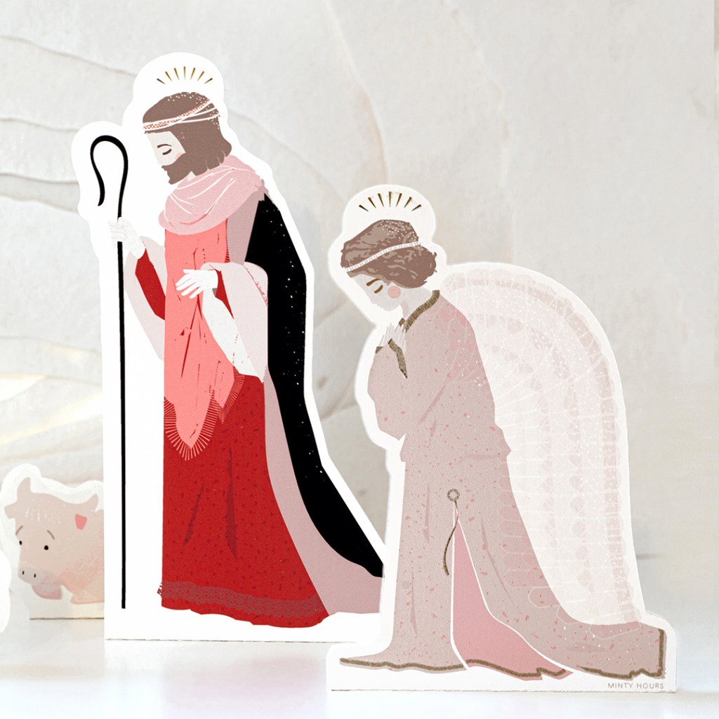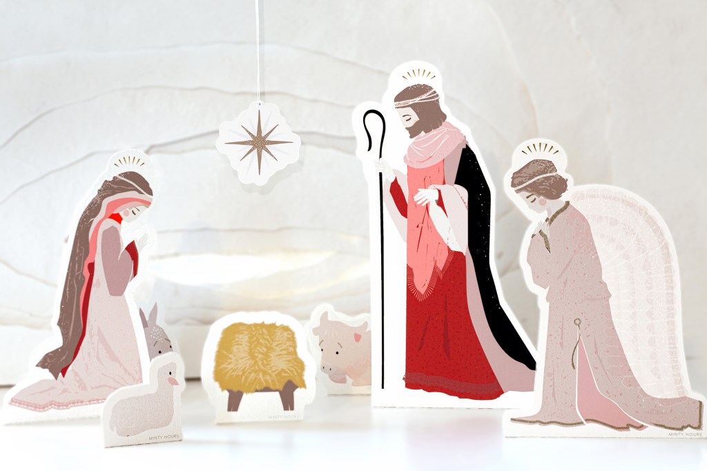 Dans cet esprit, Minty Hours vous propose cette délicate petite crèche à découper et à monter. Le recueillement habité des belles figures de Joseph, Marie et l’Ange nous invite à trouver notre propre attitude intérieure d’accueil, de gratitude, d’action de grâce, afin de faire de notre cœur une petite crèche vivante pour l’Enfant Jésus.