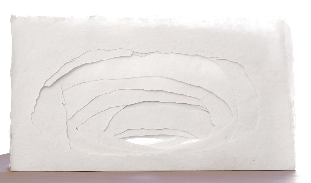 A l’aide d’un cutter, créer sur la première feuille (celle qui sera à l’avant-plan) une sorte de grand ovale (de la forme d’une pomme de terre) en évitant un tracé trop lisse. Au contraire, la main doit un peu trembler et ne pas chercher à faire bien. Procéder de même sur la deuxième feuille mais en créant un ovale un peu plus petit. A mesure que cet ovale va rétrécir, il présentera une forme de plus en plus allongée, en particulier sur les trois dernière feuilles. Sur la dernière feuille (celle de l’arrière-plan) l’ouverture sera petite, fine et oblongue